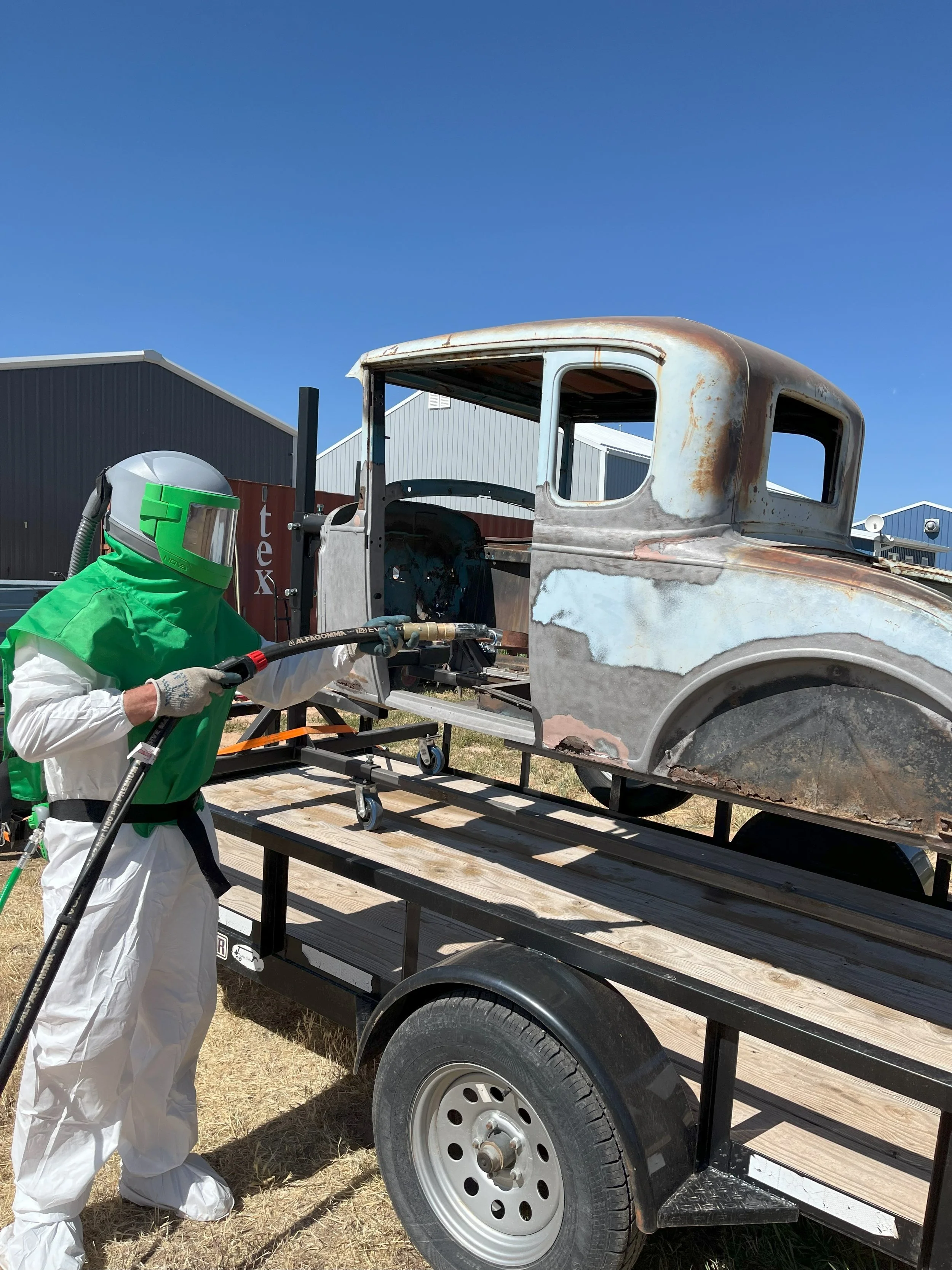 Blasting an antique car by first stripping away all the old paint and rust to prepare for the restoration.